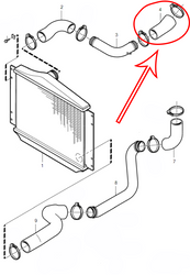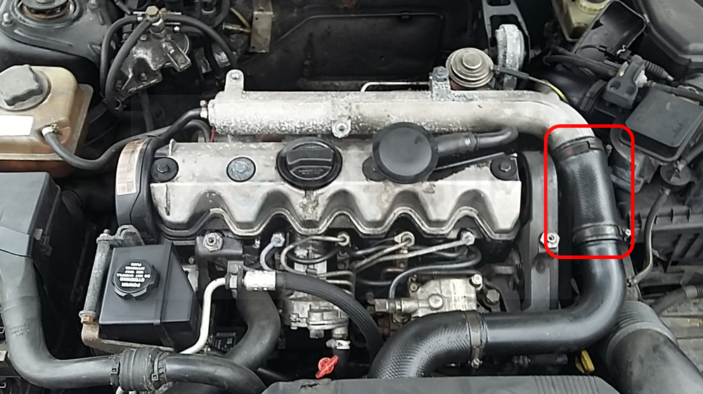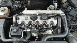 Przewód łączący kolektor ssący z plastikową rurą intercoolera, górny obok akumulatora. Na schemacie oznaczony czerwoną ramką.